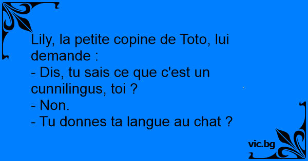 Lily, la petite copine de Toto, lui demande :<br />- Dis, tu sais ce que c'est un сunnilingus, toi ?<br />- Non.<br />- Tu donnes ta langue au chat ?