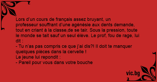 Lors d’un cours de français assez bruyant, un professeur souffrant d’une agénésie aux dents demande, tout en criant à la classe,de se tair. Sous la pression, toute le monde se tait sauf un seul élève. Le prof, fou de rage, lui dit :