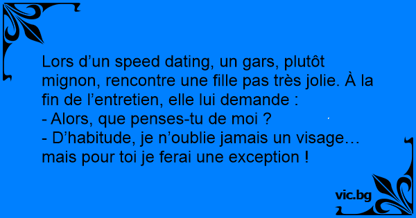 Lors d’un speed dating, un gars, plutôt mignon, rencontre une fille pas très jolie. À la fin de l’entretien, elle lui demande :