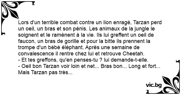 Tarzan havde engang mistet en arm et øje og sin penis. Derfor gik han til doktoren og spurgte hvad han skulle gøre. Så gav doktoren ham bare en abe arm et ørne øje og et elefant snabel. 2 uger...