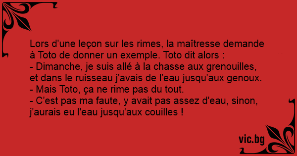 Lors d'une leçon sur les rimes, la maîtresse demande à Toto de donner un exemple. Toto dit alors :