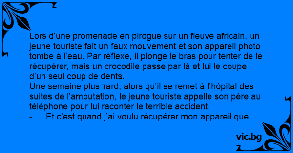 Lors d’une promenade en pirogue sur un fleuve africain, un jeune touriste fait un faux mouvement et son appareil photo tombe à l’eau. Par réflexe, il plonge le bras pour tenter de le récupérer, mais un crocodile passe par là et lui le coupe d’un seul coup de dents.