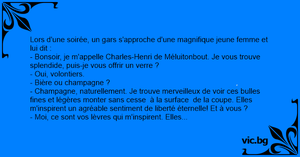 - Bonsoir, je m'appelle Charles-Henri de Méluitonbout. Je vous trouve splendide, puis-je vous offrir un verre ?
