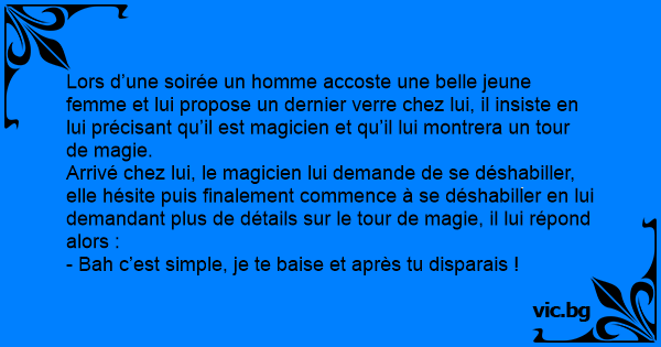 Lors d’une soirée un homme accoste une belle jeune femme et lui propose un dernier verre chez lui, il insiste en lui précisant qu’il est magicien et qu’il lui montrera un tour de magie.