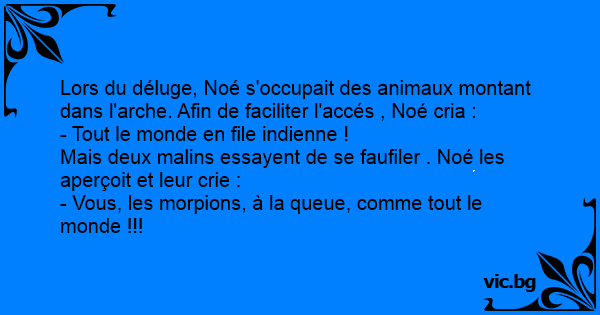 Lors du déluge, Noé s'occupait des animaux montant dans l'arche. Afin de faciliter l'accés , Noé cria :
