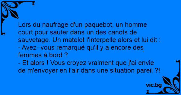 Lors du naufrage d'un paquebot, un homme court pour sauter dans un des canots de sauvetage. Un matelot l'interpelle alors et lui dit :