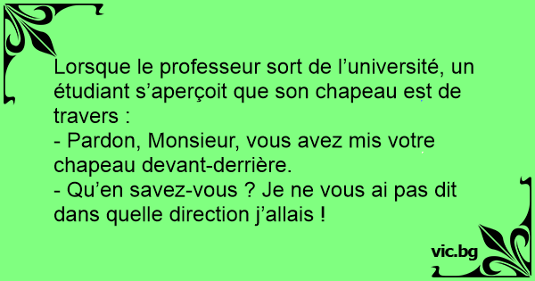 Lorsque le professeur sort de l’université, un étudiant s’aperçoit que son chapeau est de travers :