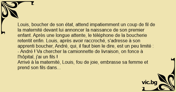 Louis, boucher de son état, attend impatiemment un coup de fil de la maternité devant lui annoncer la naissance de son premier enfant. Après une longue attente, le téléphone de la boucherie retentit enfin. Louis, après avoir raccroché, s'adresse à son apprenti boucher, André, qui, il faut bien le dire, est un peu limité :