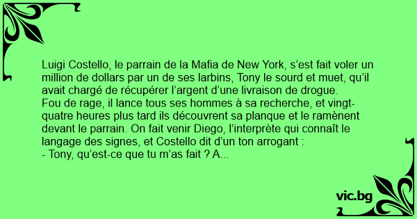 - Tony ! Si tu ne me dis pas tout de suite où est le fric, je te fais découper à la tronçonneuse et je coule les morceaux dans le béton ! Traduis, Diego !