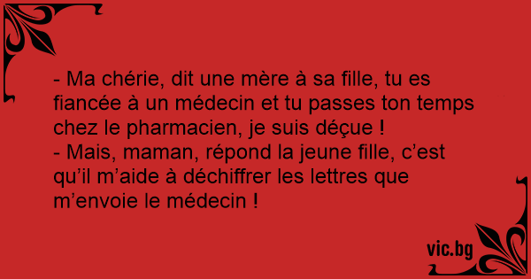 - Ma chérie, dit une mère à sa fille, tu es fiancée à un médecin et tu passes ton temps chez le pharmacien, je suis déçue !