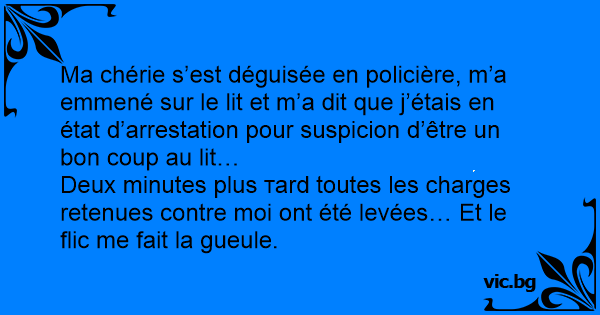 Ma chérie s’est déguisée en policière, m’a emmené sur le lit et m’a dit que j’étais en état d’arrestation pour suspicion d’être un bon coup au lit…