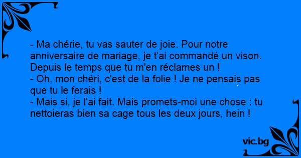 - Ma chérie, tu vas sauter de joie. Pour notre anniversaire de mariage, je t'ai commandé un vison. Depuis le temps que tu m'en réclames un !
