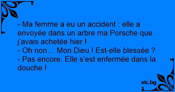 - Ma femme a eu un accident : elle a envoyée dans un arbre ma Porsche que j’avais achetée hier !