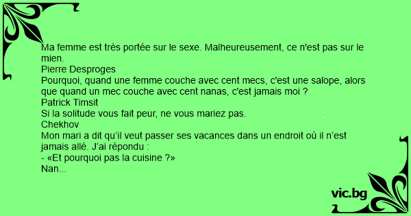 Ma femme est très portée sur le sexe. Malheureusement, ce n'est pas sur le mien.