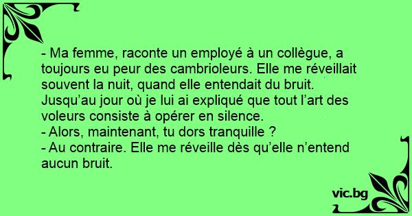 - Ma femme, raconte un employé à un collègue, a toujours eu peur des cambrioleurs. Elle me réveillait souvent la nuit, quand elle entendait du bruit. Jusqu’au jour où je lui ai expliqué que tout l’art des voleurs consiste à opérer en silence.