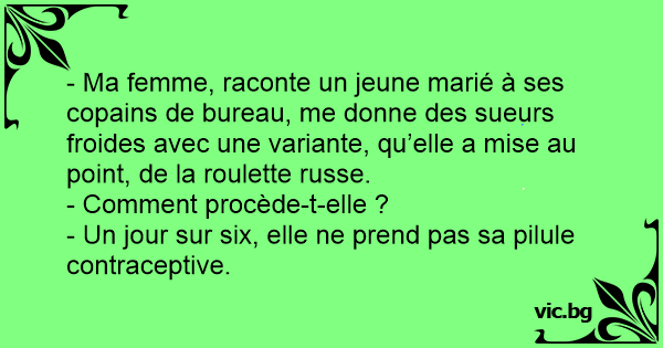 - Ma femme, raconte un jeune marié à ses copains de bureau, me donne des sueurs froides avec une variante, qu’elle a mise au point, de la roulette russe.
