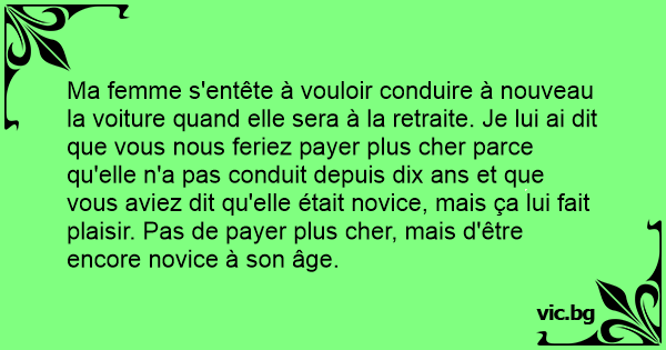 Ma femme s'entête à vouloir conduire à nouveau la voiture quand elle sera à la retraite. Je lui ai dit que vous nous feriez payer plus cher parce qu'elle n'a pas conduit depuis dix ans et que vous aviez dit qu'elle était novice, mais ça lui fait plaisir. Pas de payer plus cher, mais d'être encore novice à son âge.