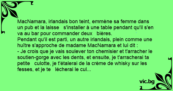 MacNamara, irlandais bon teint, emmène sa femme dans un pub et la laisse s'installer à une table pendant qu'il s'en va au bar pour commander deux bières.