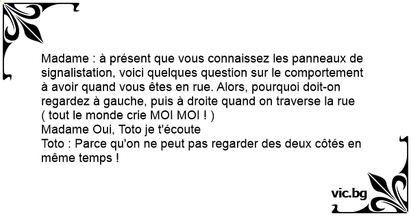 Madame : à présent que vous connaissez les panneaux de signalistation, voici quelques question sur le comportement à avoir quand vous êtes en rue. Alors, pourquoi doit-on regardez à gauche, puis à droite quand on traverse la rue
