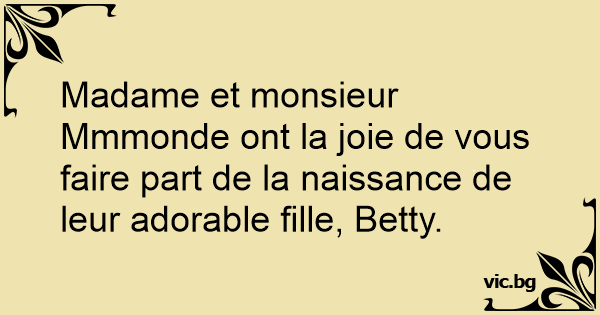 Madame et monsieur Mmmonde ont la joie de vous faire part de la naissance de leur adorable fille, Betty.