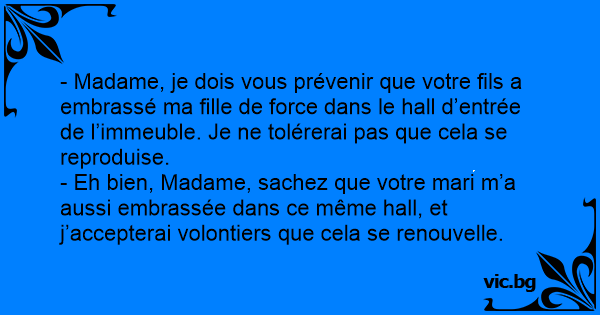 - Madame, je dois vous prévenir que votre fils a embrassé ma fille de force dans le hall d’entrée de l’immeuble. Je ne tolérerai pas que cela se reproduise.