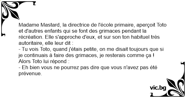 Madame Mastard, la directrice de l'école primaire, aperçoit Toto et d'autres enfants qui se font des grimaces pendant la récréation. Elle s'approche d'eux, et sur son ton habituel très autoritaire, elle leur dit :