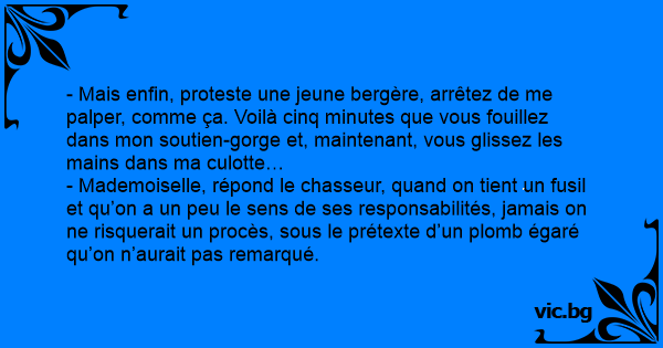 - Mais enfin, proteste une jeune bergère, arrêtez de me palper, comme ça. Voilà cinq minutes que vous fouillez dans mon soutien-gorge et, maintenant, vous glissez les mains dans ma culotte…