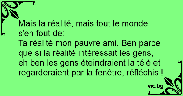 Ta réalité mon pauvre ami. Ben parce que si la réalité intéressait les gens, eh ben les gens éteindraient la télé et regarderaient par la fenêtre, réfléchis !