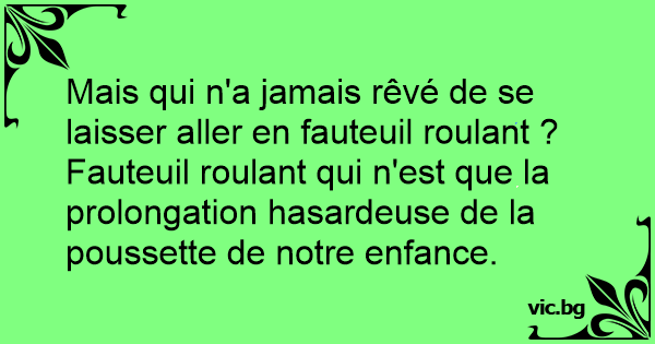 Mais qui n'a jamais rêvé de se laisser aller en fauteuil roulant ? Fauteuil roulant qui n'est que la prolongation hasardeuse de la poussette de notre enfance.
