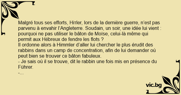 Malgré tous ses efforts, Нiтlеr, lors de la dernière guerre, n’est pas parvenu à envahir l’Angleterre. Soudain, un soir, une idée lui vient : pourquoi ne pas utiliser le bâton de Moïse, celui-là même qui permit aux Hébreux de fendre les flots ?
