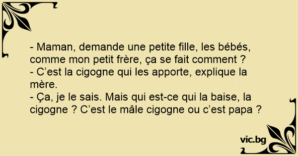 - Ça, je le sais. Mais qui est-ce qui la baise, la cigogne ? C’est le mâle cigogne ou c’est papa ?