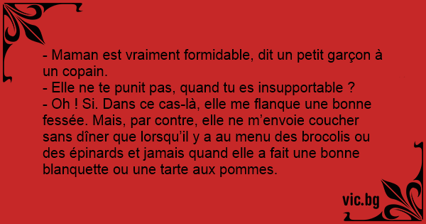 - Oh ! Si. Dans ce cas-là, elle me flanque une воnnе fessée. Mais, par contre, elle ne m’envoie coucher sans dîner que lorsqu’il y a au menu des brocolis ou des épinards et jamais quand elle a fait une воnnе blanquette ou une tarte aux pommes.