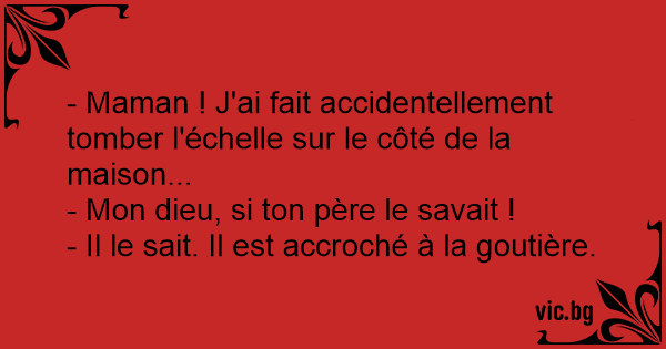 - Maman ! J'ai fait accidentellement tomber l'échelle sur le côté de la maison...<br />- Mon dieu, si ton père le savait !<br />- Il le sait. Il est accroché à la goutière.