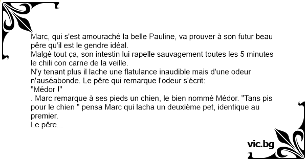 . Marc remarque à ses pieds un chien, le bien nommé Médor. "Tans pis pour le chien " pensa Marc qui lacha un deuxième pet, identique au premier.