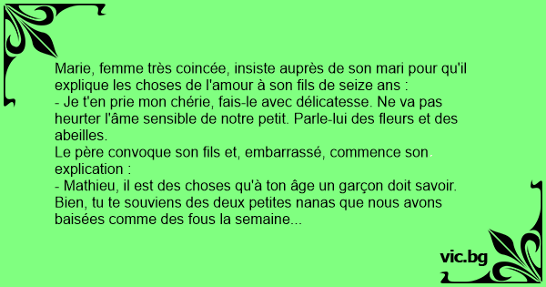 Marie, femme très coincée, insiste auprès de son mari pour qu'il explique les choses de l'amour à son fils de seize ans :