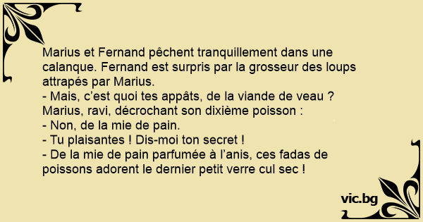 Marius et Fernand pêchent tranquillement dans une calanque. Fernand est surpris par la grosseur des loups attrapés par Marius.