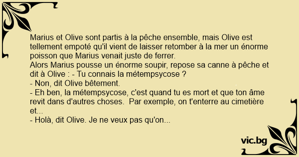 Alors Marius pousse un énorme soupir, repose sa canne à pêche et dit à Olive : - Tu connais la métempsycose ?