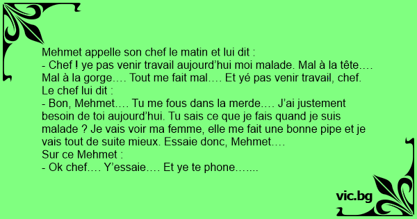 - Bon, Mehmet…. Tu me fous dans la меrdе…. J’ai justement besoin de toi aujourd’hui. Tu sais ce que je fais quand je suis malade ? Je vais voir ma femme, elle me fait une воnnе pipe et je vais tout de suite mieux. Essaie donc, Mehmet….