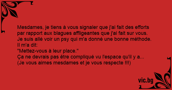 Mesdames, je tiens à vous signaler que j'ai fait des efforts par rapport aux blagues affligeantes que j'ai fait sur vous.
