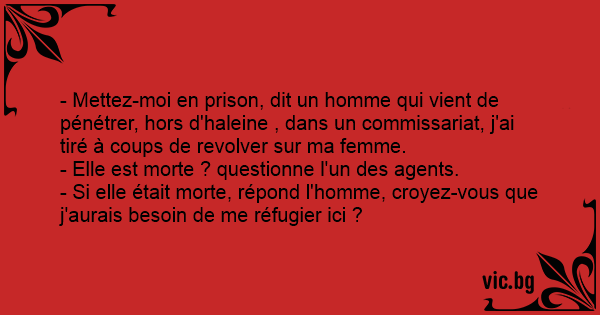 - Mettez-moi en prison, dit un homme qui vient de pénétrer, hors d'haleine , dans un commissariat, j'ai tiré à coups de revolver sur ma femme.