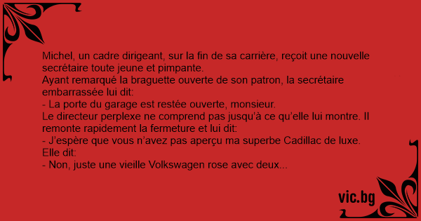 Une sécretaire remarque que la braguette du pantalon de son patron est ouverte. Alors elle lui dit en lui montrant du doigt : - Heu Monsieur la porte de votre garage est resté ouverte Il...