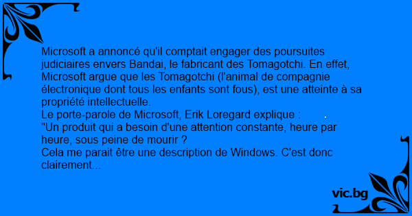 Microsoft a annoncé qu'il comptait engager des poursuites judiciaires envers Bandai, le fabricant des Tomagotchi. En effet, Microsoft argue que les Tomagotchi (l'animal de compagnie électronique dont tous les enfants sont fous), est une atteinte à sa propriété intellectuelle.