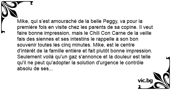 Mike, qui s’est amouraché de la belle Peggy, va pour la première fois en visite chez les parents de sa copine. Il veut faire воnnе impression, mais le Chili Соn Carne de la veille fais des siennes et ses intestins le rappelle à son bon souvenir toutes les cinq minutes. Mike, est le centre d'intérêt de la famille entière et fait plutôt воnnе impression. Seulement voilà qu'un gaz s'annonce et la douleur est telle qu'il ne peut qu'adopter la solution d'urgence le contrôle absolu de ses abdominaux et de ses muscles fessiers pour en claquer un silencieux dans les coussins du fauteuil. Il lutte de toutes ses forces et finit par accomplir sa mission.
