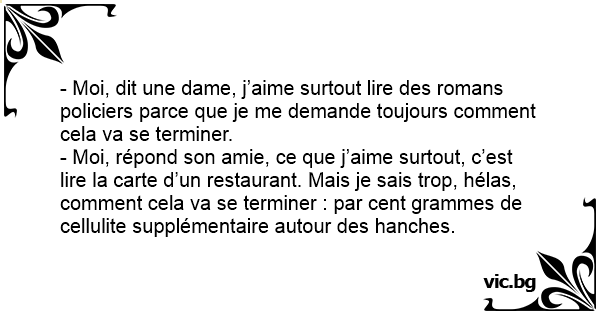 - Moi, répond son amie, ce que j’aime surtout, c’est lire la carte d’un restaurant. Mais je sais trop, hélas, comment cela va se terminer : par cent grammes de cellulite supplémentaire autour des hanches.