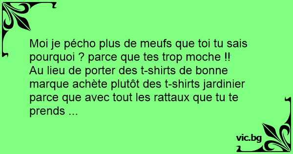 Moi je pécho plus de meufs que toi tu sais pourquoi ? parce que tes trop moche !!<br />Au lieu de porter des t-shirts de воnnе marque achète plutôt des t-shirts jardinier parce que avec tout les rattaux que tu te prends ...