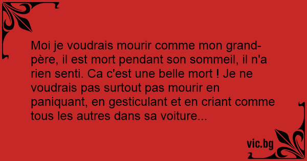 Moi je voudrais mourir comme mon grand-père, il est mort pendant son sommeil, il n'a rien senti. Ca c'est une belle mort ! Je ne voudrais pas surtout pas mourir en paniquant, en gesticulant et en criant comme tous les autres dans sa voiture...