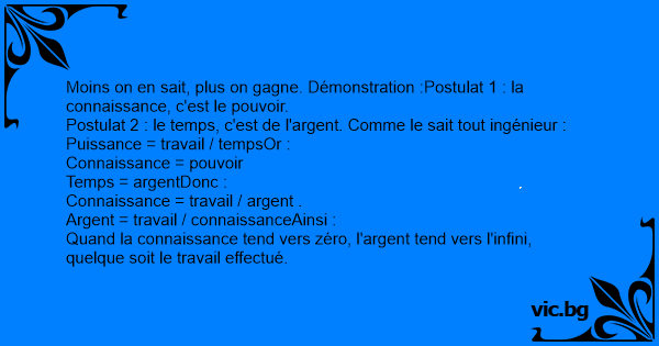 Moins on en sait, plus on gagne. Démonstration :Postulat 1 : la connaissance, c'est le pouvoir.