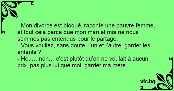 - Mon divorce est bloqué, raconte une pauvre femme, et tout cela parce que mon mari et moi ne nous sommes pas entendus pour le partage.
