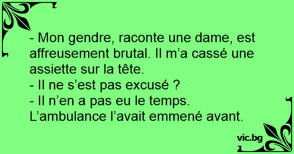 - Mon gendre, raconte une dame, est affreusement brutal. Il m’a cassé une assiette sur la tête.