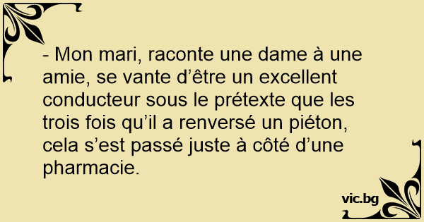 - Mon mari, raconte une dame à une amie, se vante d’être un excellent conducteur sous le prétexte que les trois fois qu’il a renversé un piéton, cela s’est passé juste à côté d’une pharmacie.